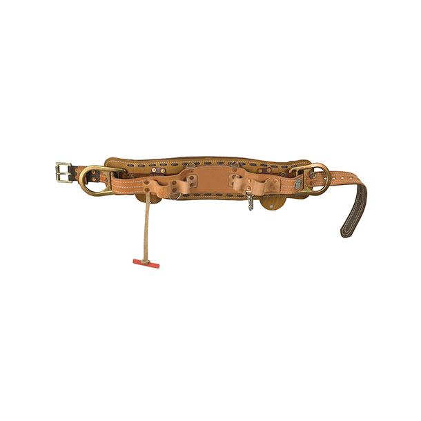 Latigo-leather belt pad is laced and stitched with two pocket tabs. Rolled-edge leather belt cushion for comfort when leaning back. 5” (127 mm) overall width. Padded for maximum comfort and body fit. 1-3/4” (44 mm) wide Klein-Kord® belt strap covered with top-grain harness leather for long-lasting use. Full-floating D-ring web strap with straight double-bar D-rings.